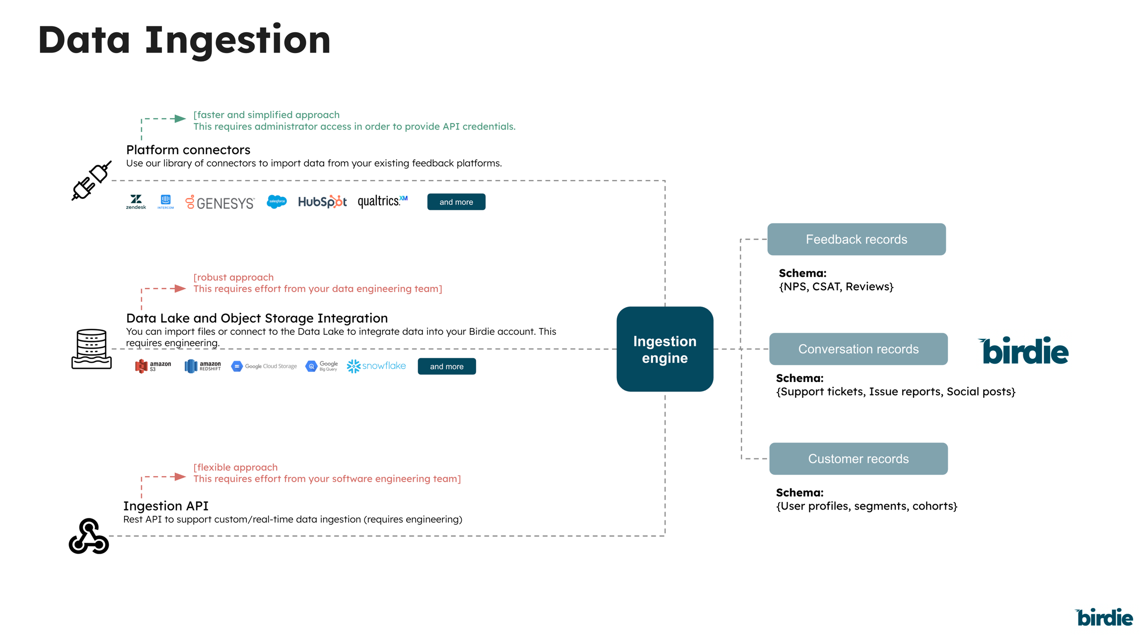 Birdie requires well-defined data sources for integration. We provide connectors to data lakes, APIs, and even web crawlers for data ingestion. Data enrichment results can be returned to the client's data lake if needed.