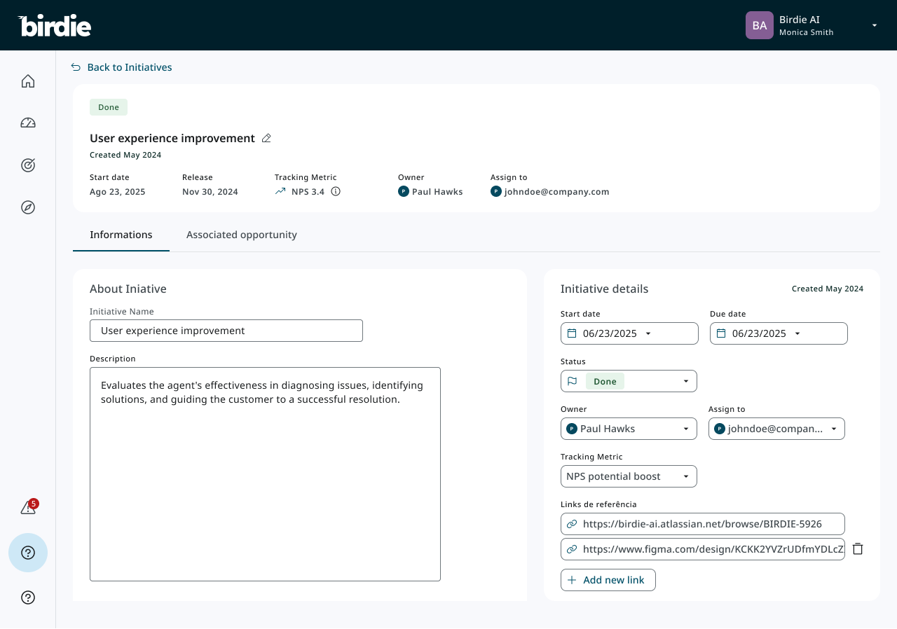 • External assignees: you can now assign initiatives to people outside Birdie, just by adding their email. (This is for internal tracking; no external notification is sent.)